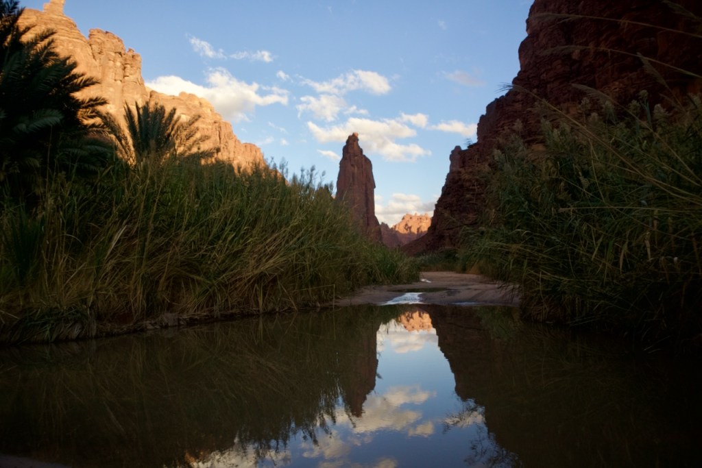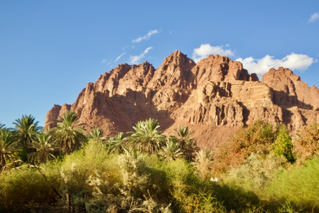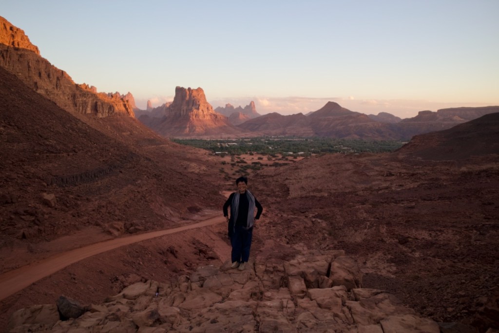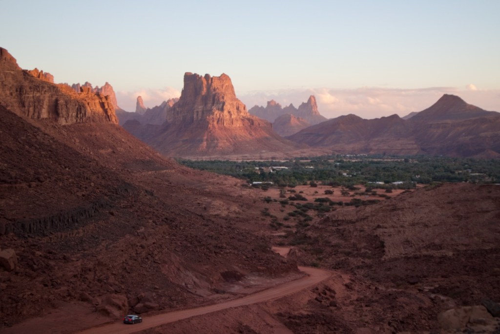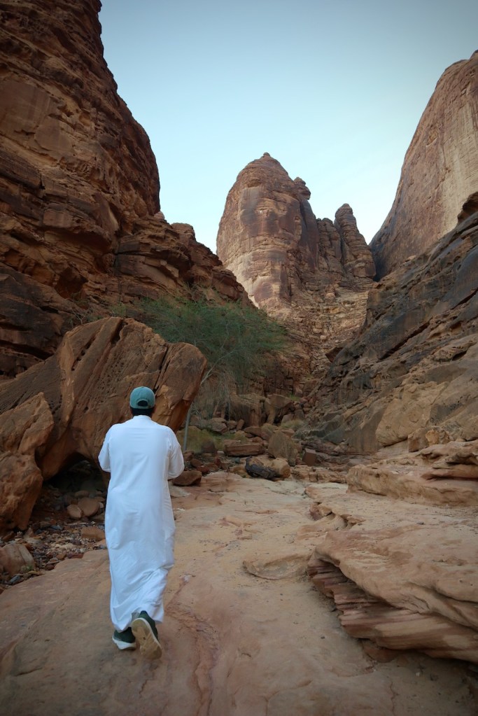Instead of booking a pricey day tour to Wadi Disah, I take the bus bound for Duba and get off at the junction for Al Disah where my Saudi adventure begins. The driver drops me at the wrong junction, and I start hitching the way to Al Disah. Coming from Riyadh, the jaw-dropping scenery could not have been more different. Flanked by spectacular mountains and rock formations, the country back roads open up vista after vista. Thanks to generous Saudi drivers, a worker heading somewhere and a teacher returning home, all bewildered by this intrepid solo woman traveller, I make it to Al Disah by four in the afternoon and find the oasis cloaked in her golden hour. The wadi is closed, I am told. Alhamdullilah/praise be to God, the rain fell nonstop two days before. Turki, my driver, proposes to take me to another wadi instead, for sunset shots and so much more. Stunning landscapes, rock art, and a sweeping view of the entire valley. A total blessing in disguise!