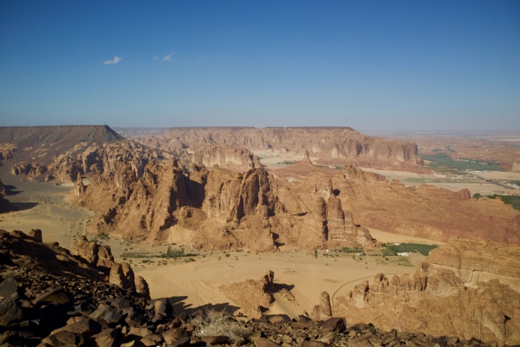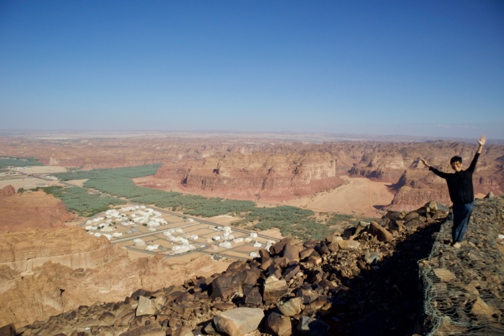 Al Ula is arguably the most famous site in Saudi Arabia easily accessible by flight, bus, or car. From Al Disah, however, there is no public transportation, so I study my offline map and ask Turki to drop me at the first junction in early morning. Schwaq, Shghb, Beda, and, inchallah, Al Ula. I arrive after noon and head straight to the Winter Park. The tickets to Hegra are sold out, but the last tour to Dadan is still available. While enjoying Arabian coffee and munching dates in the waiting area, I meet John from Amsterdam who kindly takes me up to Harrat Viewpoint (supposedly closed for renovation). We make it to the top and snap a few quick shots of the almost 360-degree vistas from above.