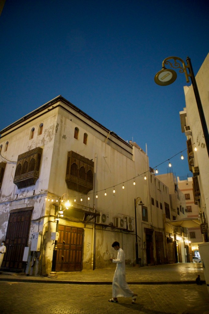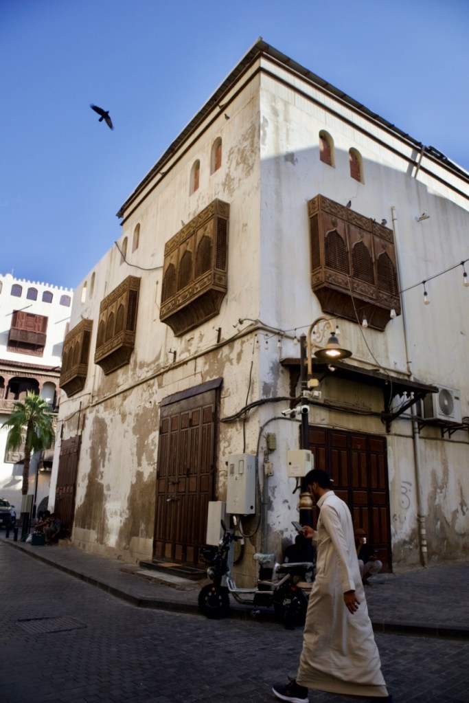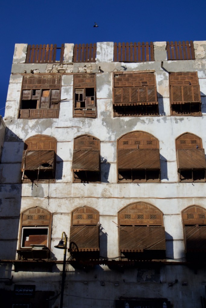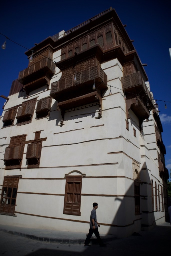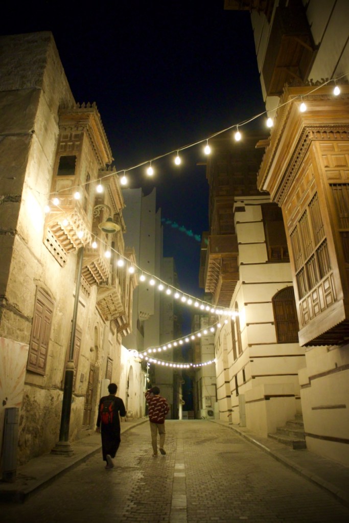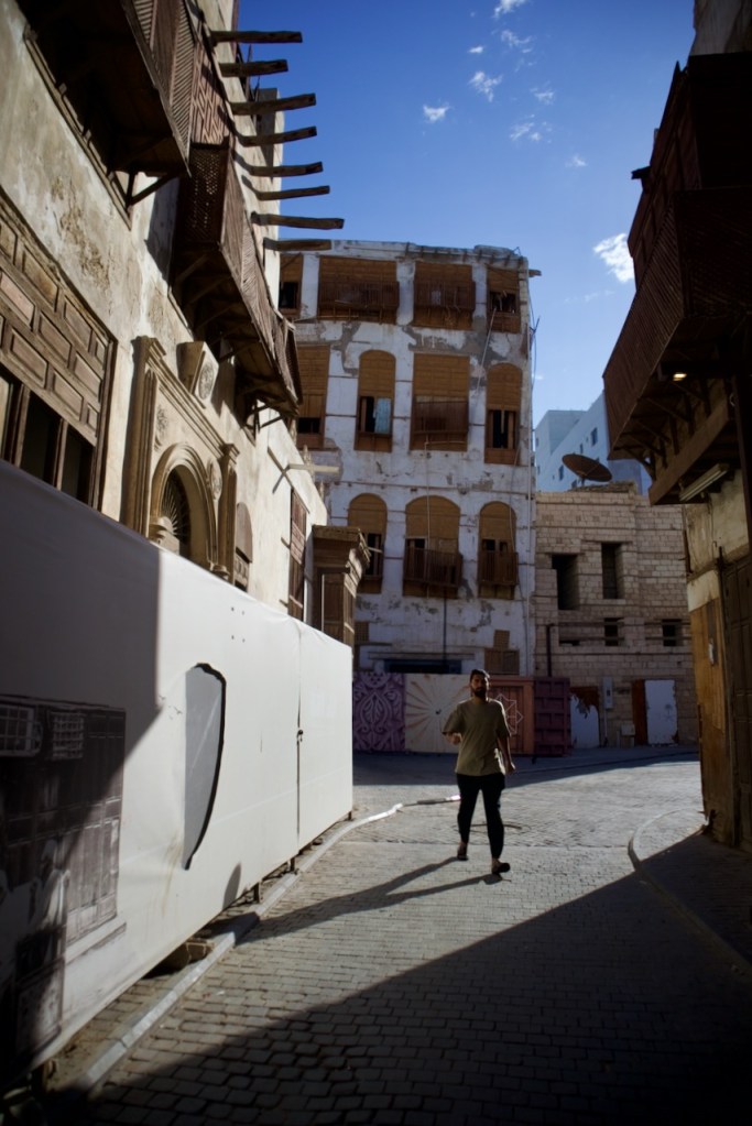 After dreaming and planning this trip for so long, I am excited to arrive in my final destination and explore Jeddah. Known for her modernism and cosmopolitanism, this great port city offers a blend of both tradition and development, exuding relaxed, cool vibes so different from the rest of the country. After another red-eye flight, the airport bus drops me right by the Bab Sharif of Al Balad at seven in the morning. Not having reserved any hotel, I plan to go with the flow like my entire trip in the past two weeks. The light and shadow, so intricately displayed on the gorgeous wooden balconies and coral-stone structures, take me by twists and turns into the plentiful narrow alleys. With an early riser here and an itinerant cat there, morning workers grabbing a quick bite and merchants opening their shops, Al Balad is my best photographic experience. An evening stroll here is magical, so romantic that you feel like you are in a film set. Locals chill in heritage building-turned cafes, lovers murmur sweet words, and parents bring their children to do open-air art. Winter is so mild here along the Red Sea coast that one can linger into the wee hours until daybreak brings another new day in timeless Al Balad. I can stay here for days, even months, to do a project, to document these exquisite architectural ruins still standing defiantly with life pulsing all around. I imagine all the lives once lived, loves fulfilled or forlorn, dreams big and small, and immeasurable loss endured. The rest of Jeddah – the iconic mosques, the corniche, the towering flagpole, and King’s fountain – pale in comparison. Al Balad is a befitting end to my journey, with the old and the new, so symbolic of a kingdom in constant remaking.