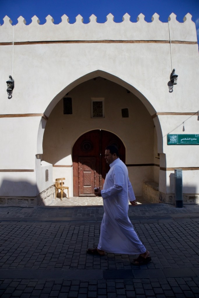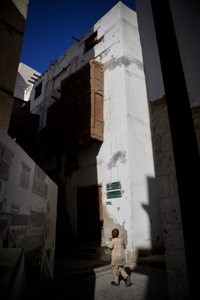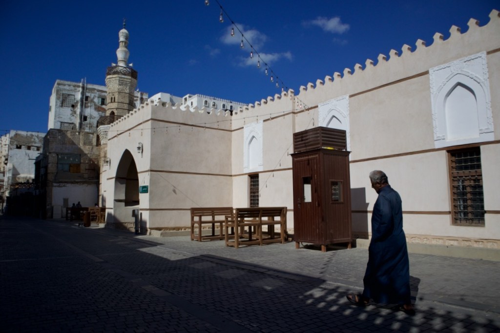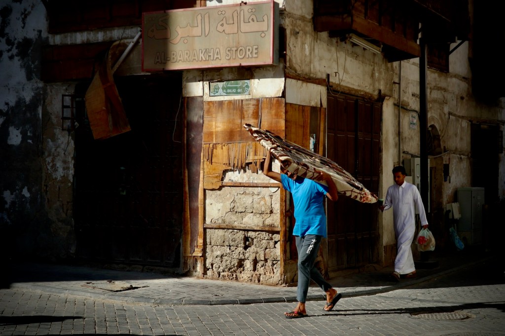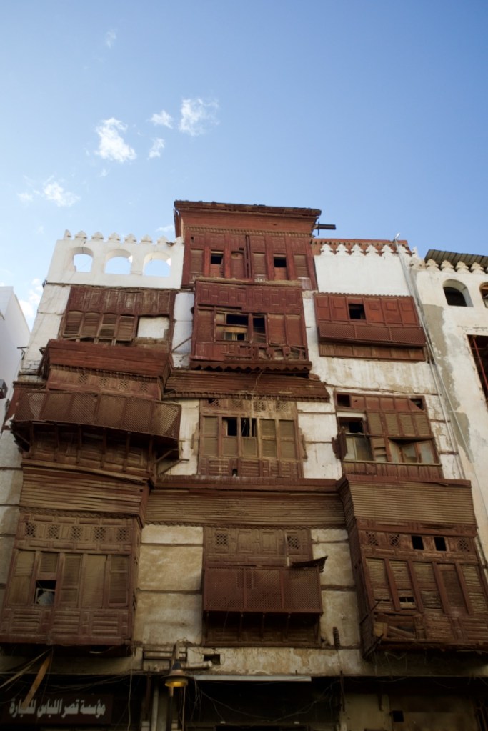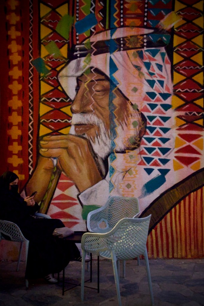 After dreaming and planning this trip for so long, I am excited to arrive in my final destination and explore Jeddah. Known for her modernism and cosmopolitanism, this great port city offers a blend of both tradition and development, exuding relaxed, cool vibes so different from the rest of the country. After another red-eye flight, the airport bus drops me right by the Bab Sharif of Al Balad at seven in the morning. Not having reserved any hotel, I plan to go with the flow like my entire trip in the past two weeks. The light and shadow, so intricately displayed on the gorgeous wooden balconies and coral-stone structures, take me by twists and turns into the plentiful narrow alleys. With an early riser here and an itinerant cat there, morning workers grabbing a quick bite and merchants opening their shops, Al Balad is my best photographic experience. An evening stroll here is magical, so romantic that you feel like you are in a film set. Locals chill in heritage building-turned cafes, lovers murmur sweet words, and parents bring their children to do open-air art. Winter is so mild here along the Red Sea coast that one can linger into the wee hours until daybreak brings another new day in timeless Al Balad. I can stay here for days, even months, to do a project, to document these exquisite architectural ruins still standing defiantly with life pulsing all around. I imagine all the lives once lived, loves fulfilled or forlorn, dreams big and small, and immeasurable loss endured. The rest of Jeddah – the iconic mosques, the corniche, the towering flagpole, and King’s fountain – pale in comparison. Al Balad is a befitting end to my journey, with the old and the new, so symbolic of a kingdom in constant remaking.