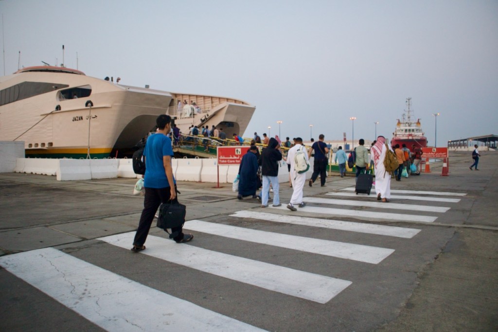 It’s a long weekend and the ferry to Farasan is full, I am told. Wake up at four and go to the office, the hotel staff advises. I dutifully follow, not wanting to miss the Maldives of Saudi Arabia, only to find the office closed till five thirty. Jmaen, the Careem driver, kindly offers me a free tour of the city at this wee hour, and so I catch the silhouette of the castle along with Jizan’s shoreline. Lo and behold, a seat is free and I make it to the famous island on the Red Sea.