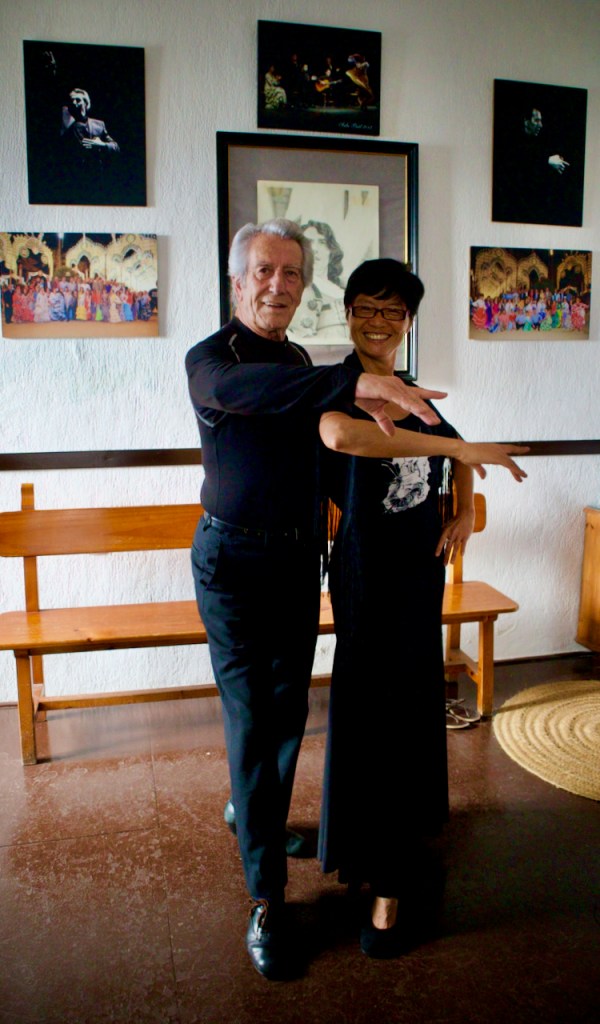 Maestro is famous for his complex buleria choreography – in eight segments, with increasing technicality – perfected over 65 years! The beginning is always a challenge: it starts on the strong down beat of 12 with four claps within 6 beats and a rapid fire entrance before the rest goes downhill: the first marking, the first call, a little flourish, followed by a second marking and a call again before exiting. Missing a buleria beginning can be the end of you, never mind the speed! It takes me a month – and a lot of stress – to nail down my first buleria and then some more to bring it up to speed, add the arms, move the skirt, tilt the head while simultaneously picking up the steps of tango, Fandango, and alegria that Maestro generously shares with me! I begin to dread Fridays when guitarists come to play, for when bulerias come live, there’s no place to hide but to hit the floor, even if your heart is on the verge of a cardiac arrest out of mortal fear. If sevillanas are a week-long affair, bulerias are lifelong knots. Through the best and worst of what is to come, and as long as we live, I will try my best!