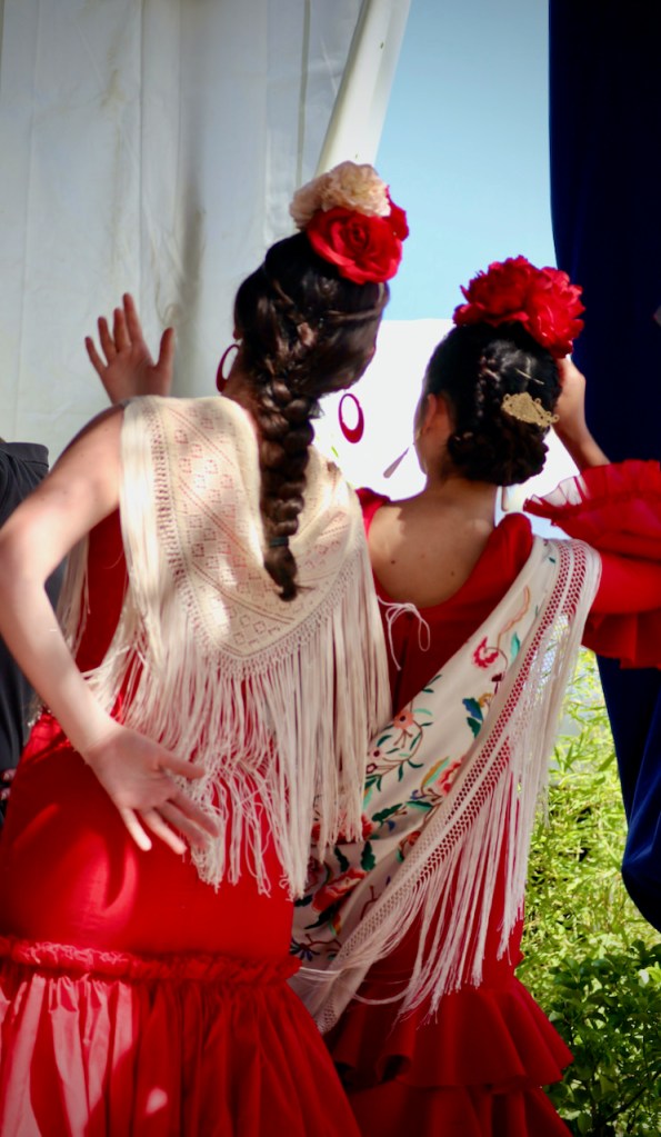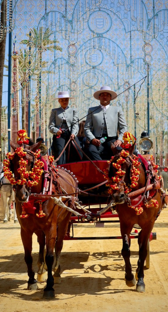 After six months of practice, it is time to test my skills in the biggest party and dance floor I have ever been. On Mother’s Day, I don on my first traje, a gypsy dress that feels like a chiffon cake, arriving at a scene straight out of a movie set: hundreds of horse-drawn carriages and handsome coach men and women crisscrossing visitors in their Feria best. What class and elegance, these Andalucians!